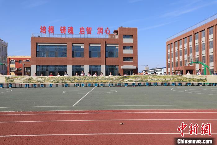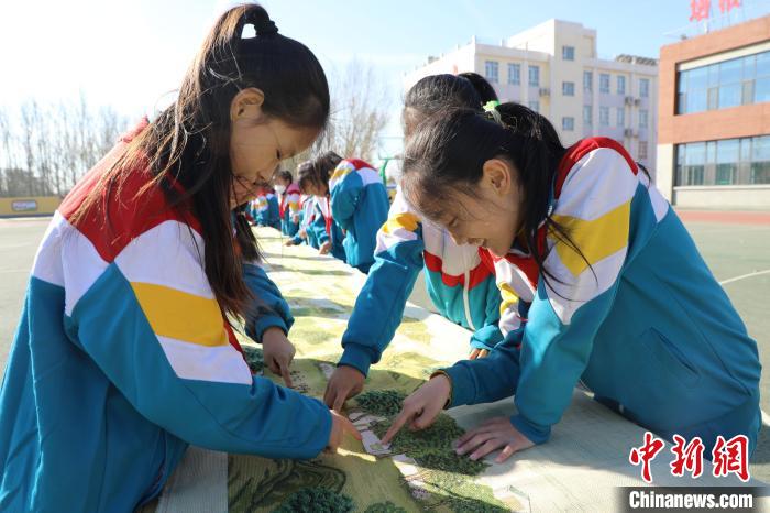 11月28日,學生在操場上觀看趙衛(wèi)平的十字繡作品《清明上河圖》。劉延嶺 攝