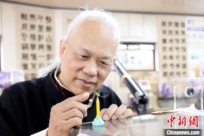 11月25日,臺灣雕刻家陳逢顯在其位于新北市的毫芒雕刻博物館,向記者展示微雕“黃金龍”。中新社記者 陳小愿 攝