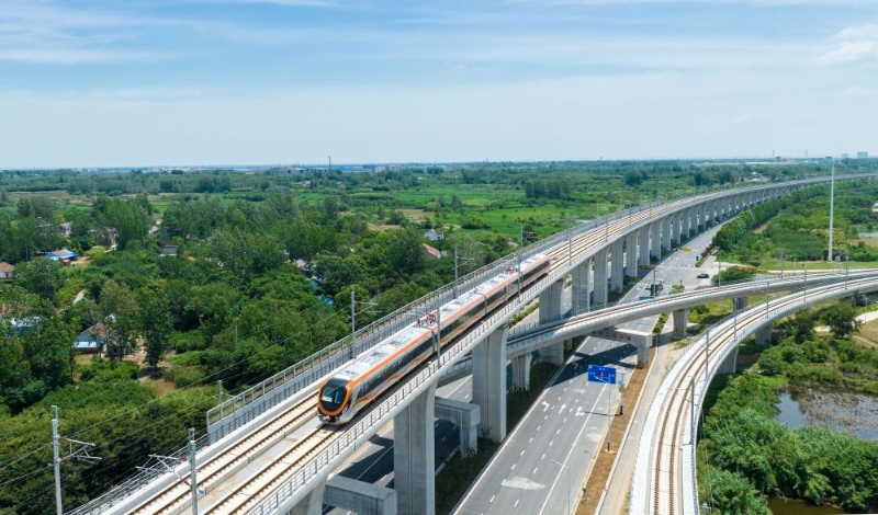 這是在安徽省滁州市來安縣境內(nèi)拍攝的滁寧城際鐵路列車(2023年6月28日攝,無人機(jī)照片)。當(dāng)日,滁寧城際鐵路滁州段開通運(yùn)營(yíng)。滁寧城際鐵路西起滁州高鐵站,止于正在規(guī)劃建設(shè)中的南京北站,全長(zhǎng)約55公里。
