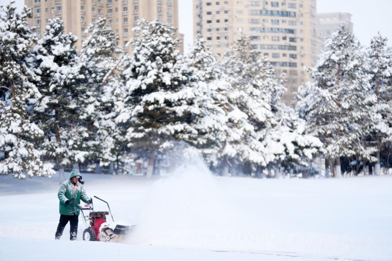 11月23日,在哈爾濱市湘江公園,工作人員在清理積雪。受寒潮影響,黑龍江省各地近日持續(xù)降溫。新華社記者 王建威 攝