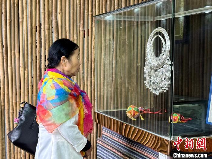 游客在隴鑒古寨參觀一個銀制的民族飾品。林潔琪 攝