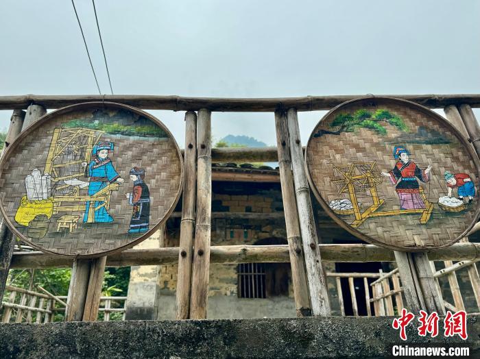 隴鑒古寨至今已有近百年歷史,圖為古民居的欄桿上掛著用簸箕繪制的壯族民俗畫。林潔琪 攝