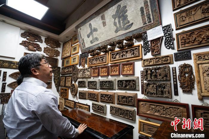 香港收藏家沈墨寧近日接受中新社記者專訪,圖為沈墨寧和他的木雕藏品。中新社記者 侯宇 攝