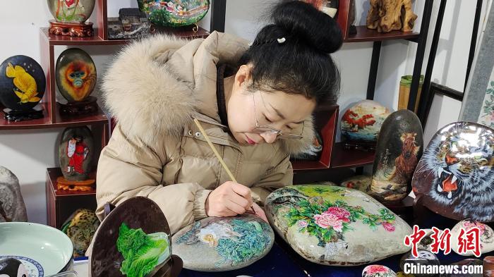 “利用秦嶺豐富的石資源,將農(nóng)民畫(huà)、油畫(huà)、國(guó)畫(huà)、水墨畫(huà)、工筆畫(huà)等技法和工藝融入石頭畫(huà)創(chuàng)作當(dāng)中?!苯衲?8歲的張娟用畫(huà)筆給石頭帶來(lái)溫度和生機(jī),讓石與畫(huà)進(jìn)行完美融合,為石頭注入傳統(tǒng)文化、鄉(xiāng)土色彩,讓其“鮮活起來(lái)”。