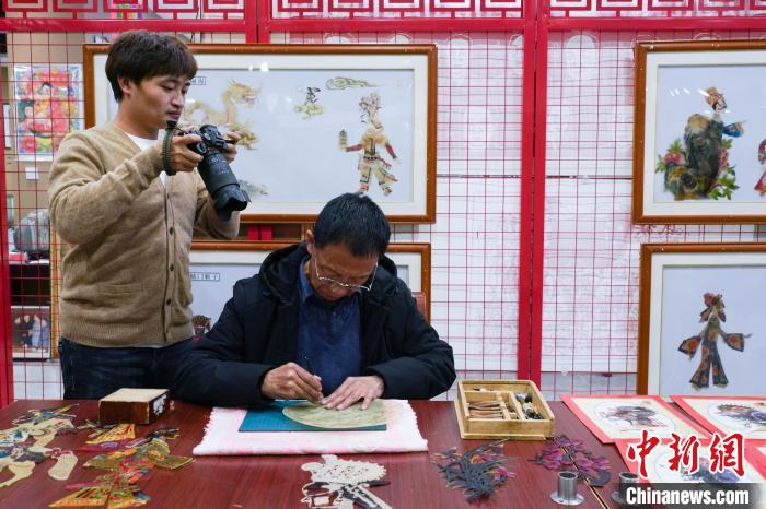 圖為皮影行家靳永紅雕刻皮影。馬銘言 攝