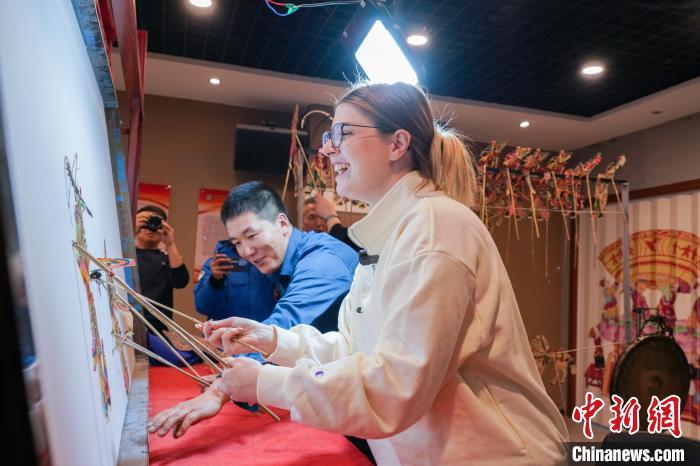圖為來自意大利的文旅達人愛琳娜體驗皮影。馬銘言 攝