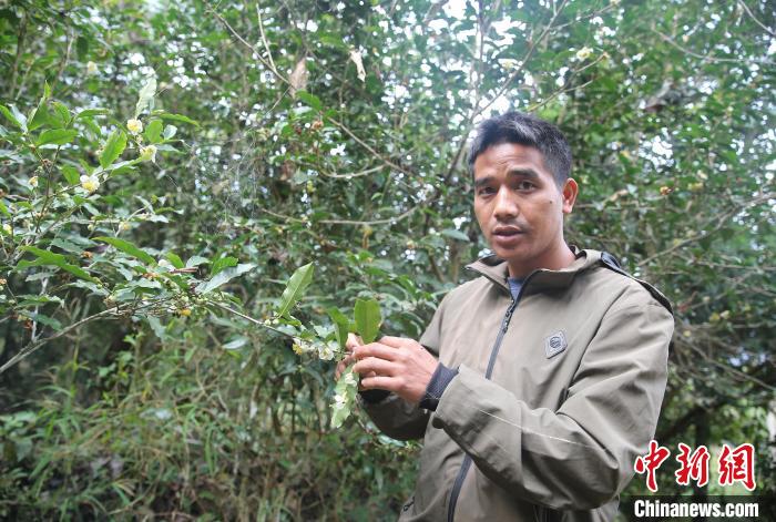 12月1日,景邁山芒景村布朗族村民桑達(dá)為記者介紹村中茶樹。中新社記者 黃興鴻 攝