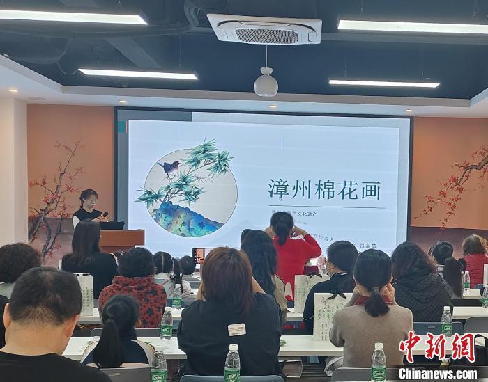 圖為活動(dòng)現(xiàn)場(chǎng),漳臺(tái)青年聆聽棉花畫工藝發(fā)展歷史和獨(dú)特制作工藝。薌城區(qū)臺(tái)聯(lián)供圖