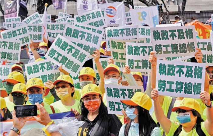 圖:12月1日,臺灣職場2023年度代表字調查出爐,勞方選擇“悶”字居多,資方選擇“缺”字居多。圖為今年5月1日,臺灣民眾集會怒斥民進黨當局漠視勞工權益。\資料圖片