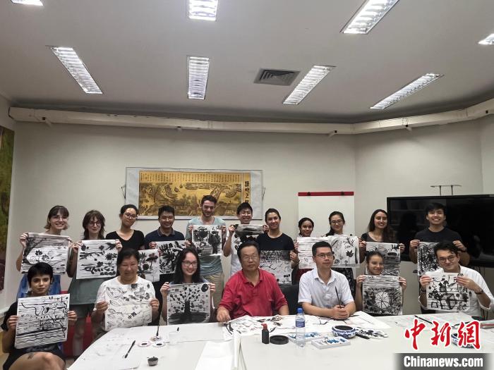 日前,湖北大學藝術學院譚崇正、鄧鴻濤兩位書畫名家走進圣保羅州立大學孔院及當?shù)囟嗨⑿W,開展水墨畫工作坊。圖為水墨畫教學現(xiàn)場。中新社記者林春茵攝