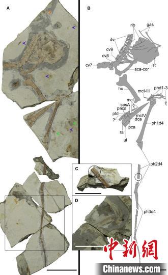 中國熱河生物群約1.3億年前地層中發(fā)現(xiàn)的翼龍新屬種——“華北克拉通翼龍”化石標本。中新網(wǎng)記者 孫自法 攝