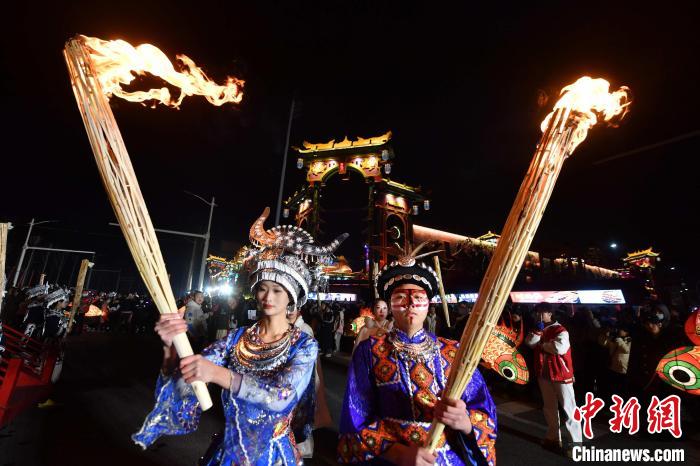 身著盛裝的工作人員手舉火把巡游。王海濱 攝