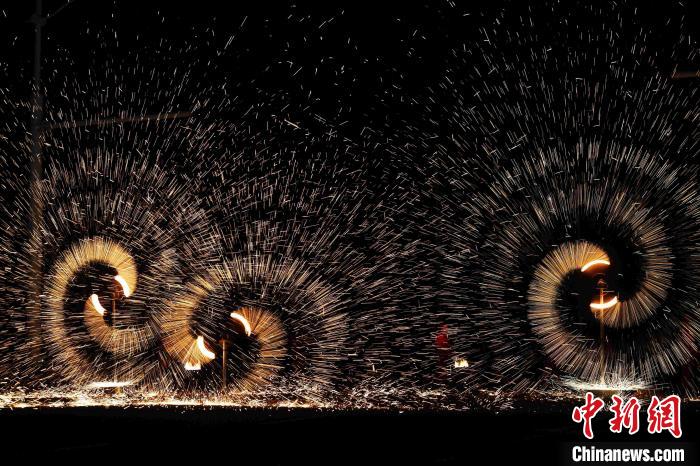 工作人員表演打鐵花時火花四濺渲染了冬日夜空。王海濱 攝