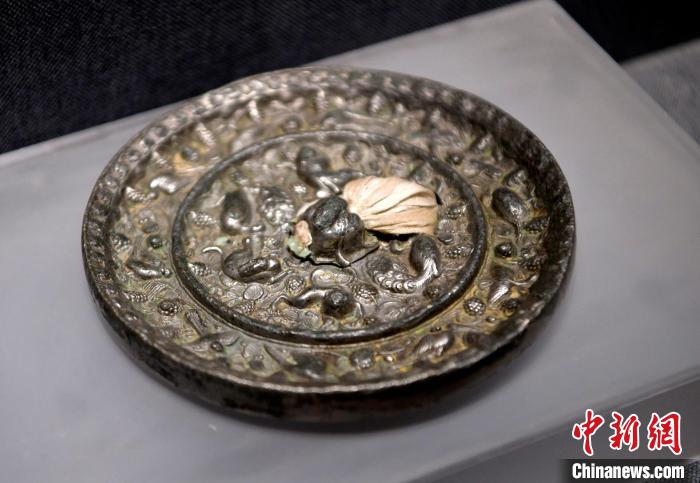 圖為日喀則博物館展出的唐代瑞獸葡萄鏡。李林 攝
