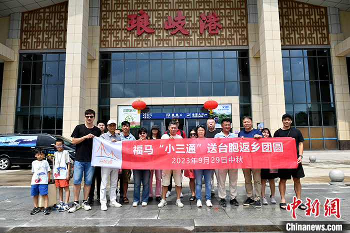 圖為2023年9月29日,臺(tái)胞臺(tái)屬在福州馬尾瑯岐港進(jìn)站口前合影,準(zhǔn)備搭乘福馬“小三通”航線返臺(tái)過中秋。 中新社記者 呂明 攝