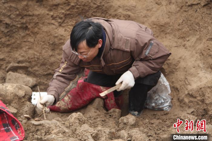 2012年1月16日,何利群在鄴城遺址東郭區(qū)佛教造像埋藏坑遺跡進行現(xiàn)場發(fā)掘?!?鄴城考古隊供圖)