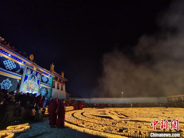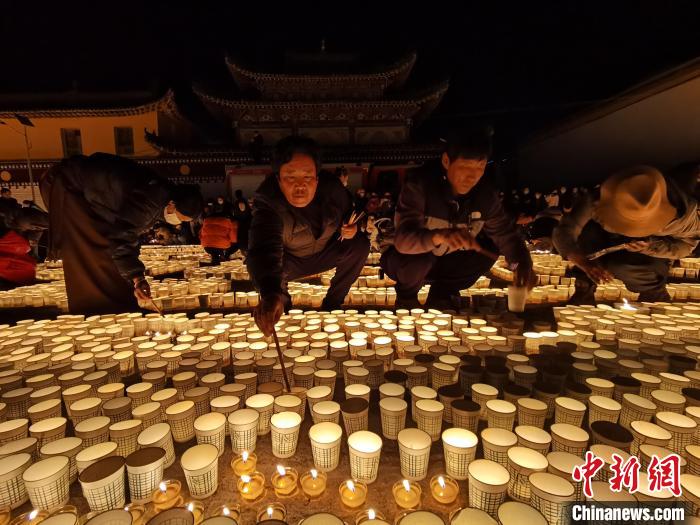 中新社青海黃南12月7日電 題:線下燃燈+云供燈 青海藏傳佛教格魯派寺院迎燃燈日