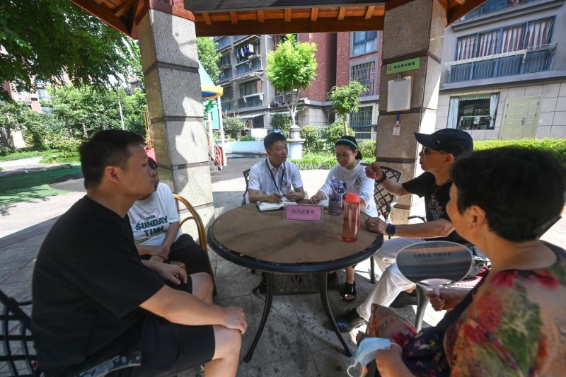 7月21日,在位于浙江省杭州市臨安區(qū)錦南街道水岸陽光小區(qū)的陽光議事廳,街道干部在聽取居民們反映的問題及意見。新華社記者 徐昱 攝