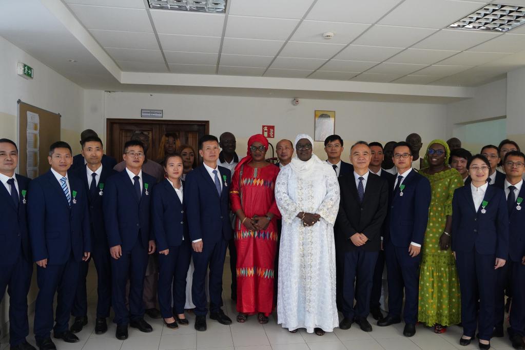 11月2日,在塞內(nèi)加爾首都達喀爾,塞內(nèi)加爾衛(wèi)生和社會行動部長恩迪亞耶與中國醫(yī)療隊隊員在儀式后合影。塞內(nèi)加爾政府當天為中國第19批援塞醫(yī)療隊全體隊員頒發(fā)勛章和榮譽證書,以表彰他們?yōu)槿t(yī)療衛(wèi)生事業(yè)作出的卓越貢獻。新華社記者 王子正 攝