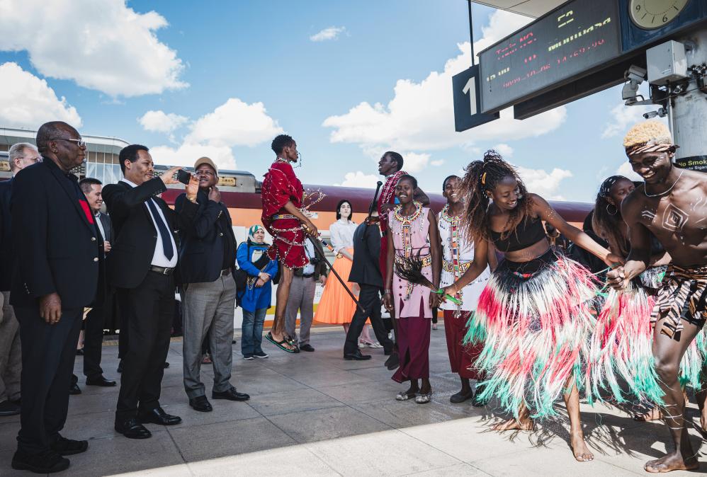 受肯尼亞鐵路局邀請,俄羅斯、南非、伊朗、沙特阿拉伯等國駐肯使節(jié)10月6日參觀蒙內(nèi)鐵路調(diào)度中心,并乘坐列車從首都內(nèi)羅畢到肯尼亞港口城市蒙巴薩。這是多國駐肯使節(jié)當天在蒙內(nèi)鐵路內(nèi)羅畢站觀看文藝演出。新華社記者 王冠森 攝
