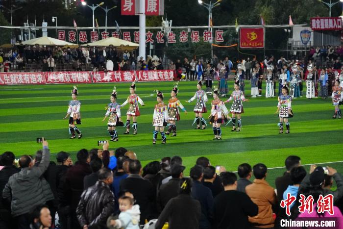 綠茵場上,兩隊球員的汗水濕透了衣衫,但拼勁兒絲毫不減;觀眾席不時傳出歡呼聲和敲鑼打鼓聲為兩隊球員加油助威。中場休息,當?shù)囟弊逋泶┟褡宸棻硌萘藰O具侗族風(fēng)格特色的節(jié)目。