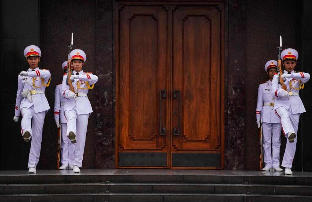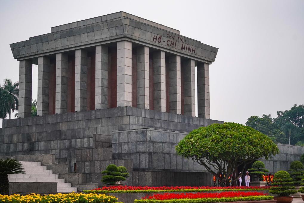 在河內(nèi)地標(biāo)巴亭廣場(chǎng)一側(cè),坐落著胡志明陵和胡志明故居。記者抵達(dá)廣場(chǎng)時(shí),守衛(wèi)胡志明陵的儀仗兵正在舉行換崗儀式,眾多民眾和游客高舉相機(jī)或手機(jī),記錄下這莊嚴(yán)肅穆的一刻。胡志明陵北側(cè)的胡志明故居內(nèi),各國(guó)游客排起長(zhǎng)隊(duì),在他曾長(zhǎng)期居住和工作的高腳屋下駐足留影。