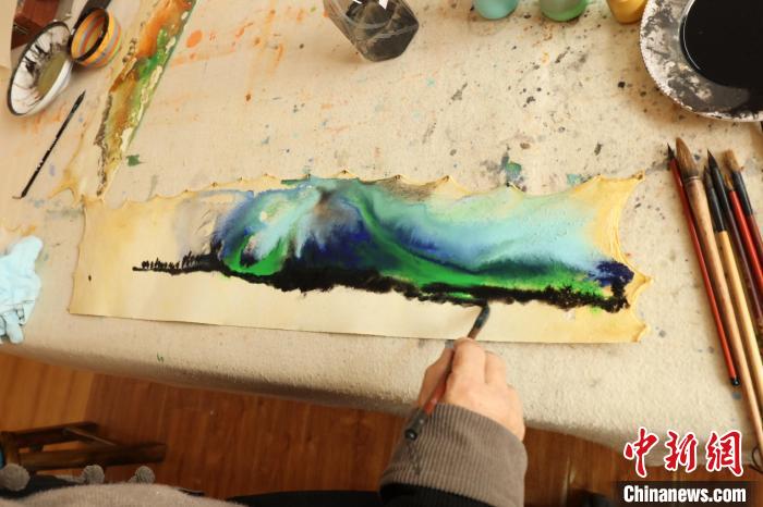 12月12日,閆立國正在牛皮上作畫。尚長治 攝