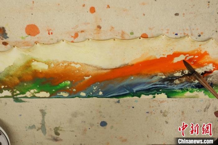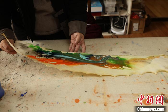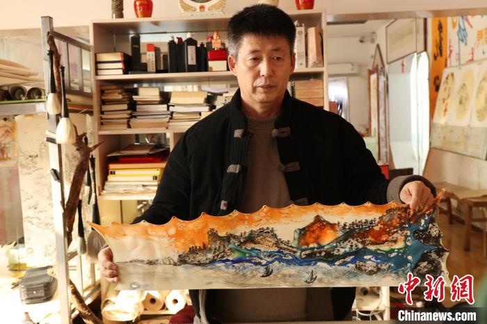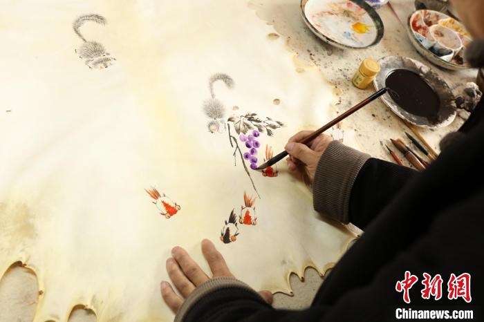12月12日,走進(jìn)河北省衡水市皮畫藝人閆立國的工作室,他正在牛皮上作畫。