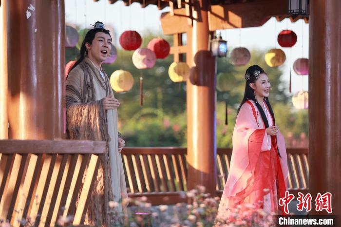 中新網(wǎng)南寧12月13日電 “蒹葭蒼蒼,白露為霜,所謂伊人,在水一方……”美妙的歌聲日前飄蕩在散發(fā)著花香的廣西壯族自治區(qū)藥用植物園詩經(jīng)植物園中?,F(xiàn)場,一座造型精致典雅的水榭廊亭中,音樂劇《詩經(jīng)·采薇》的演員們在這里完成了沉浸式的戶外演出。