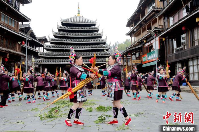 圖為侗族婦女在表演蘆笙踩堂。龔普康 攝