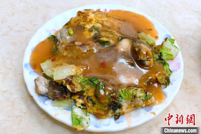 近日,臺北寧夏夜市里圓環(huán)邊蚵仔煎店的蚵仔煎。中新社記者 陳小愿 攝