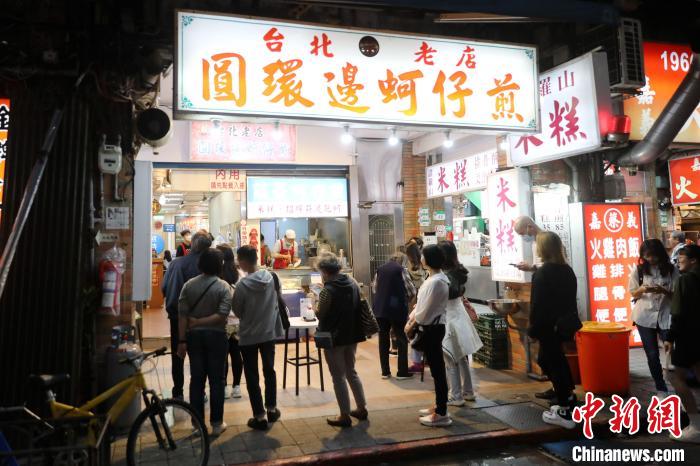 近日,臺北寧夏夜市里的圓環(huán)邊蚵仔煎店,顧客在門口排隊。中新社記者 陳小愿 攝