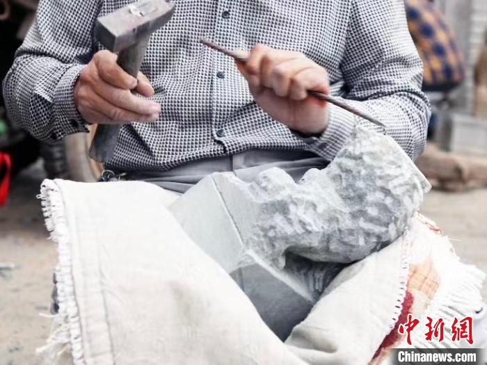 圖為綏德石匠在雕刻石獅子。受訪者供圖