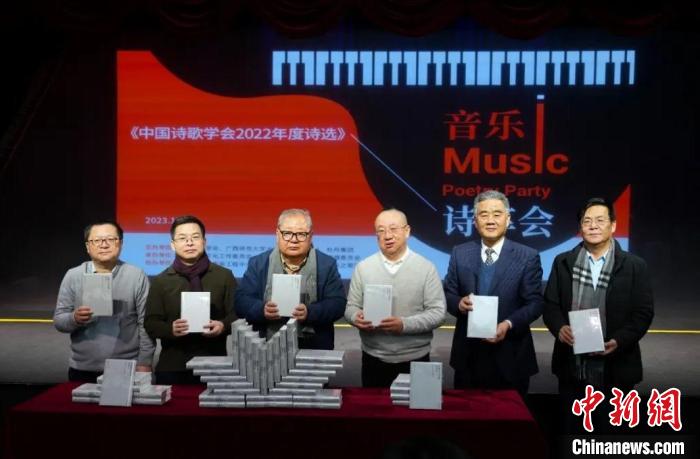 在音樂詩享會上,著名詩人吉狄馬加等嘉賓共同為《在黎明灰色的山脊上:中國詩歌學(xué)會2022年度詩選》出版揭幕。