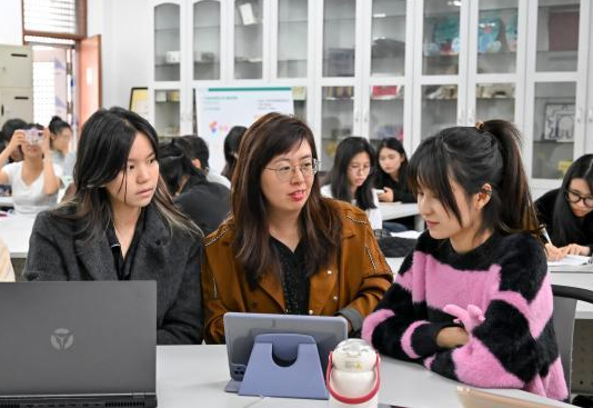 近日,謝雅卉(右一)與同學(xué)們在課堂上討論廣告設(shè)計內(nèi)容。中新社記者 陳驥旻 攝