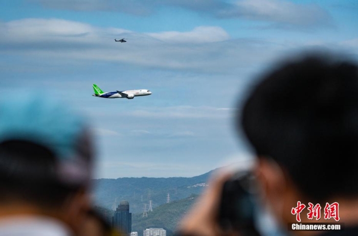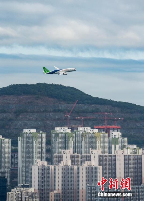 圖為C919在香港島上空繞飛。中新網(wǎng)記者 侯宇 攝