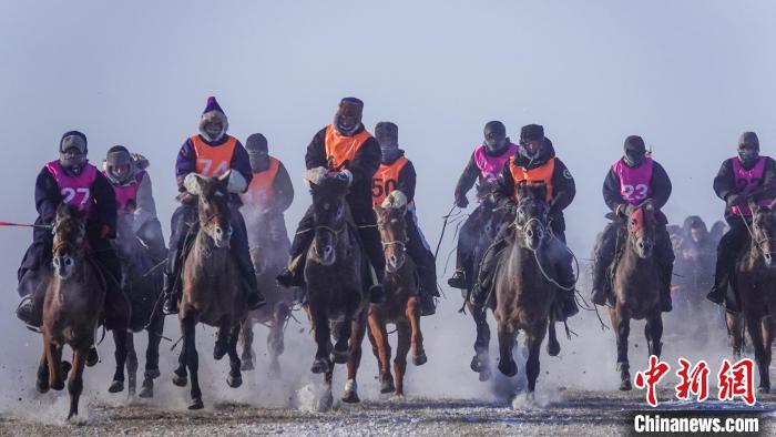 圖為冰雪那達慕現(xiàn)場,牧民騎馬馳騁?!侮豢?攝