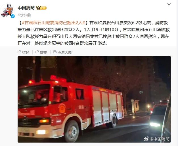 中新網(wǎng)12月19日電 據(jù)國(guó)家消防救援局官方微博消息,甘肅臨夏積石山縣突發(fā)6.2級(jí)地震,消防救援力量已在震區(qū)救出被困群眾2人。