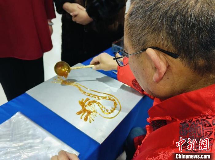 糖畫是童年的甜蜜回憶,來自鼓樓區(qū)的非遺傳承人柴建啟用小湯勺舀起熔化了的糖汁飛快地來回澆鑄,畫出龍的矯然昂首,龍鬃飛灑,隨即用小鏟刀將糖畫鏟起,粘上竹簽。這一糖畫寓意富貴吉祥、福壽綿延,襯托出節(jié)日的喜慶氣氛?!疤钱嬍堑氐赖拿耖g畫種,頗具特色的街市藝術(shù)。將龍用糖畫形式展現(xiàn)出來,祝福大家龍年如糖畫一樣甜甜蜜蜜。”