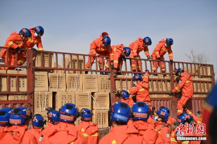 12月19日,甘肅省臨夏州積石山縣大河家鎮(zhèn),甘肅省森林消防總隊隊員搬運(yùn)救災(zāi)物資。 中新社記者 李亞龍 攝