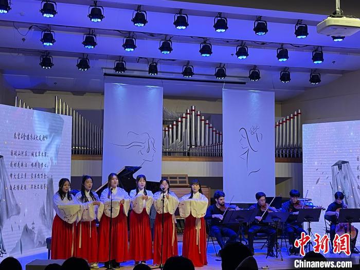 從出自詩經(jīng)的《桃夭》《蓼莪》,到李白、蘇軾的經(jīng)典詩詞,再到孔尚任的《桃花扇》,流傳數(shù)百上千年的中華名篇化作歌聲、器樂聲、吟唱聲,在該校演奏廳中婉轉(zhuǎn)飄揚,演繹成動人的愛情故事,發(fā)出跨越古今的回響。