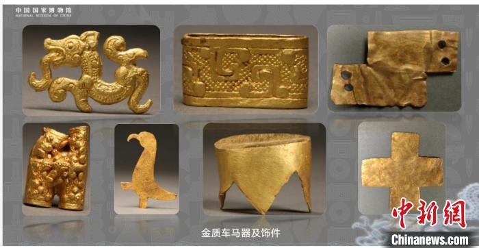 陜西寶雞下站遺址出土的金質(zhì)車馬器及飾件。(中國國家文物局供圖)