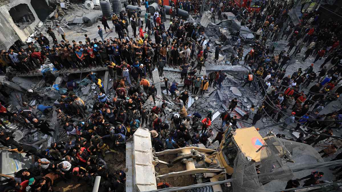 12月20日,在加沙地帶南部城市拉法,人們?cè)谝攒娍找u后開展救援。(圖源:新華社)