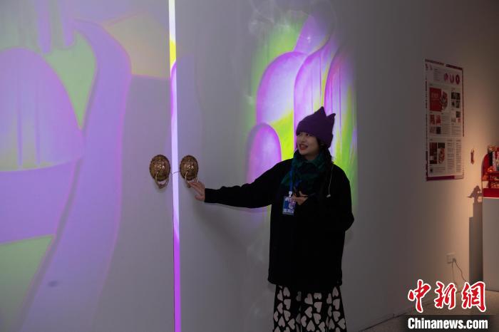 輕輕叩響鑲嵌于墻上的輔首銜環(huán),一幅幅AI影像便出現(xiàn)在墻面,觀眾猶如打開(kāi)一扇通往未來(lái)之門(mén),充滿(mǎn)無(wú)限想象。這是四川美術(shù)學(xué)院實(shí)驗(yàn)藝術(shù)學(xué)院研二學(xué)生徐晗、李芮佳帶來(lái)的作品。她們介紹,因2024年是中國(guó)農(nóng)歷的龍年,兩人便以“龍”為靈感展開(kāi)創(chuàng)作。她們將中國(guó)神話傳說(shuō)中“椒圖”的鋪首紋飾與傳統(tǒng)門(mén)扣作為交互,引領(lǐng)觀眾透過(guò)科技的“外衣”看到傳統(tǒng)文化的創(chuàng)新表達(dá)。