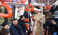 12月23日,在“阿凡提”號(hào)地鐵專列中,飾演“阿凡提”的演員與乘客互動(dòng)。