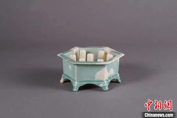 修復好的南宋龍泉窯粉青釉六方七管占景盆。杭州市文物考古研究所 供圖