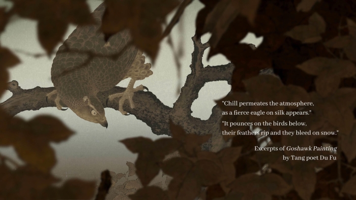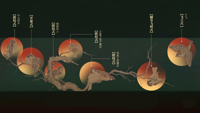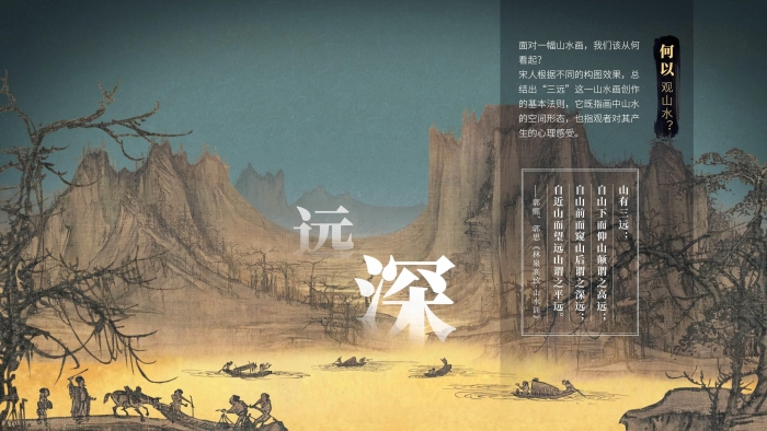 《千年調(diào)·宋代山水花鳥》數(shù)字特展網(wǎng)站6大主題垂類包括山水篇的“境、幻、趣”,以及花鳥篇的“芳、羽、靈”。每個垂類均采用不同的敘事和獨特的設(shè)計,比如,“境”講述了何以觀山水到何以畫山水,深入剖析《溪山行旅圖》與《早春圖》的寫實技法、精神內(nèi)涵和人文價值;從仙山幻景到文人的精神家園,從“幻”看宋人構(gòu)建多彩神秘,引人入勝的山水世界,代表作有《煙江疊嶂圖》《瀟湘臥游圖》等;“趣”圍繞《四景山水圖》《踏歌圖》等點景人物巨作,全方位展示宋人融入山水園林之間的生活情趣,情景交融,如身臨其境?;B篇的“芳”表達宋人愛花,全株式如《草蟲花碟圖》、折枝式如《紅白芙蓉圖》、插花如《花籃圖》……無論花卉以何種姿態(tài)躍然紙上,無不寄托著宋人崇尚自然的生活態(tài)度與恬淡雅致的審美趣味;刻畫入微,畫以傳神,宋代畫師格物窮理,對禽鳥精雕細琢的描繪在“羽”垂類中體現(xiàn)得淋漓盡致,比如劍拔弩張的《楓鷹雉雞圖》和集科學(xué)與美學(xué)于一體的《寒雀圖》;在萬物有“靈”這個垂類中,透過畫家對筆下瑞獸奇珍的描摹,體會執(zhí)筆者美好的愿景和真摯的情感,以及宋人閑處觀物、細推物理而得其樂的情趣。
