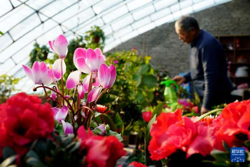 12月23日,在河北省臨城縣臨城鎮(zhèn),一名花農(nóng)在花卉大棚內(nèi)澆水。