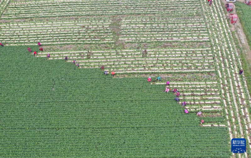 12月22日,四川省眉山市東坡區(qū)松江鎮(zhèn)三壩村村民在采收白蘿卜(無人機(jī)照片)。
