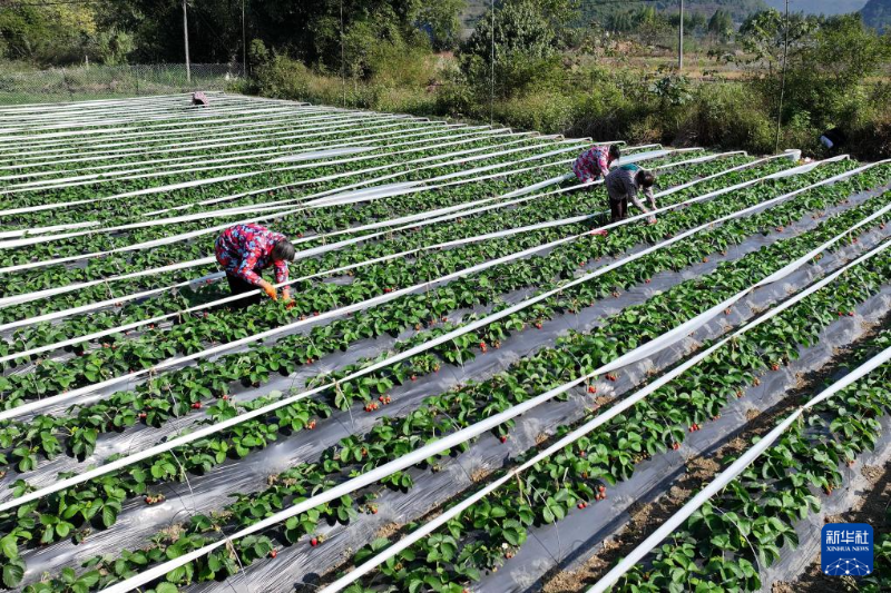 12月22日,廣西河池市羅城仫佬族自治縣四把鎮(zhèn)的農(nóng)民在管護(hù)草莓(無人機(jī)照片)。